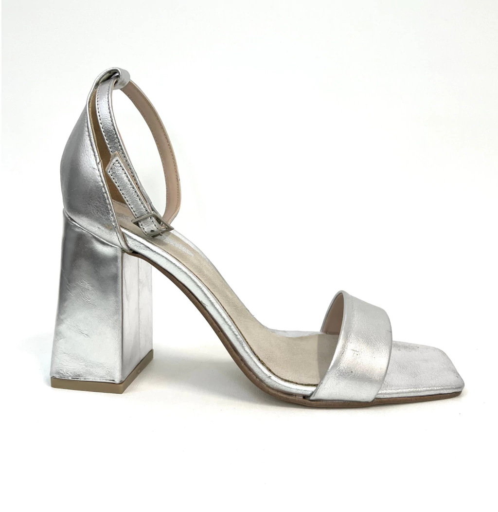 Sandalia 100% cuero, con talón cerrado y pulsera. Taco ancho de 9 cm.