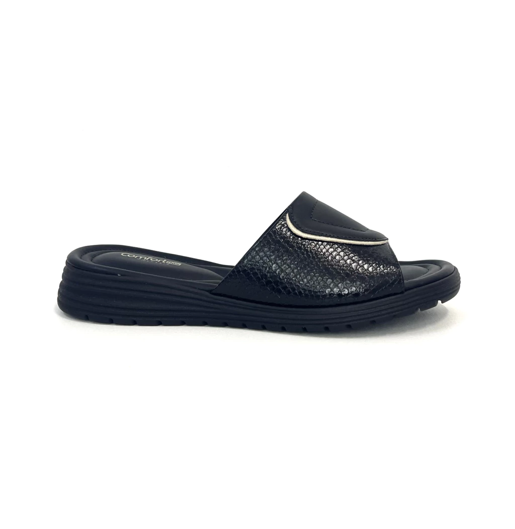 Chinela súper confort de material sintético con díseño de faja ancha.