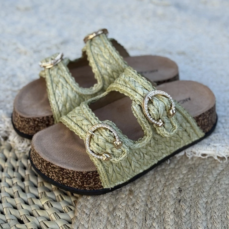 Zueco liviano con hebillas y rafia con base símil corcho