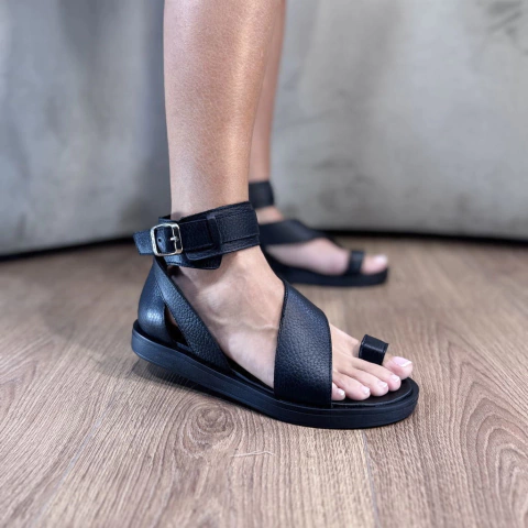 Sandalia de cuero con detalle de tira en el dedo y tobillera, codiciada por su característica estética vintage. Combinala con vestidos cortos o de corte middie.